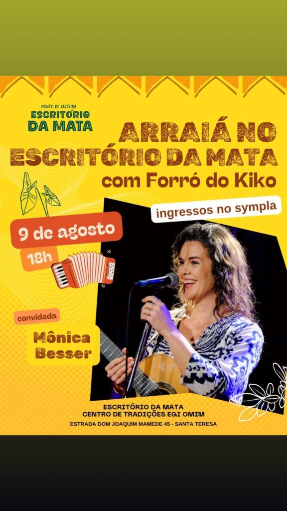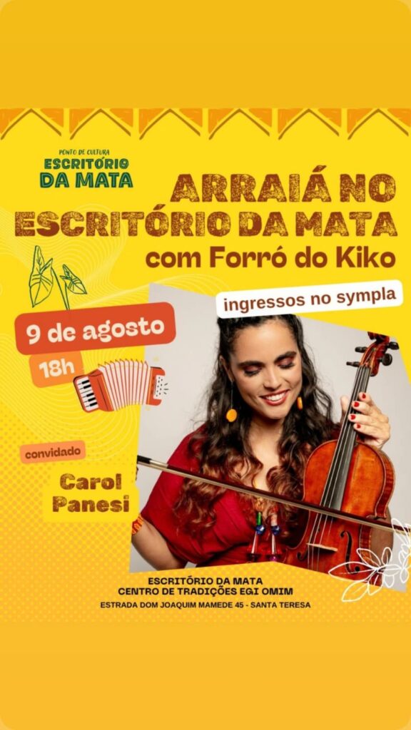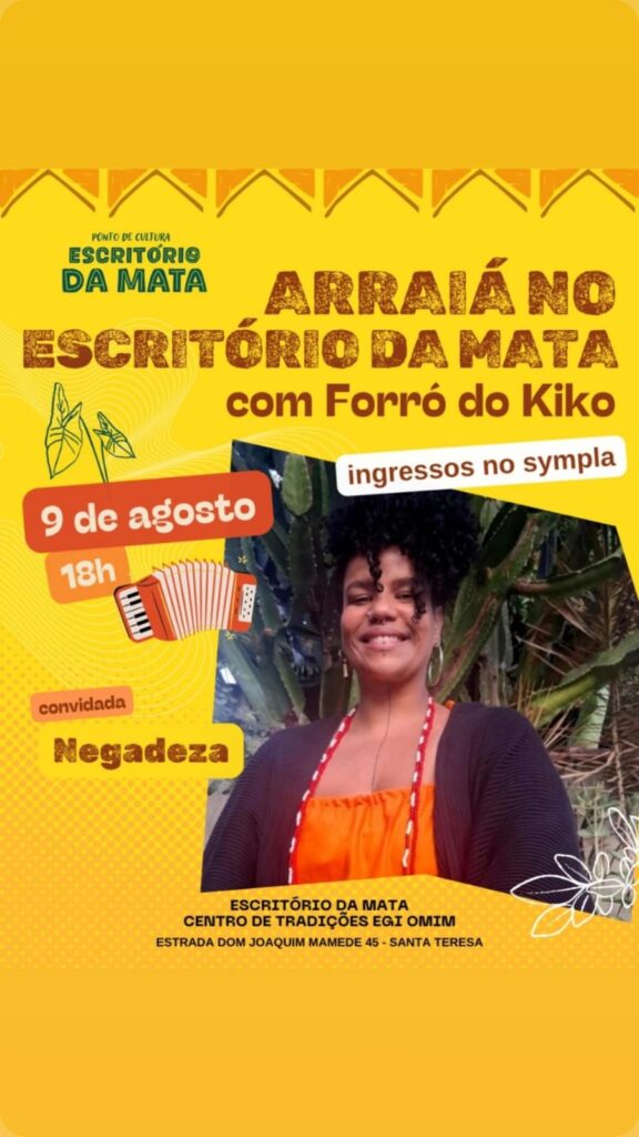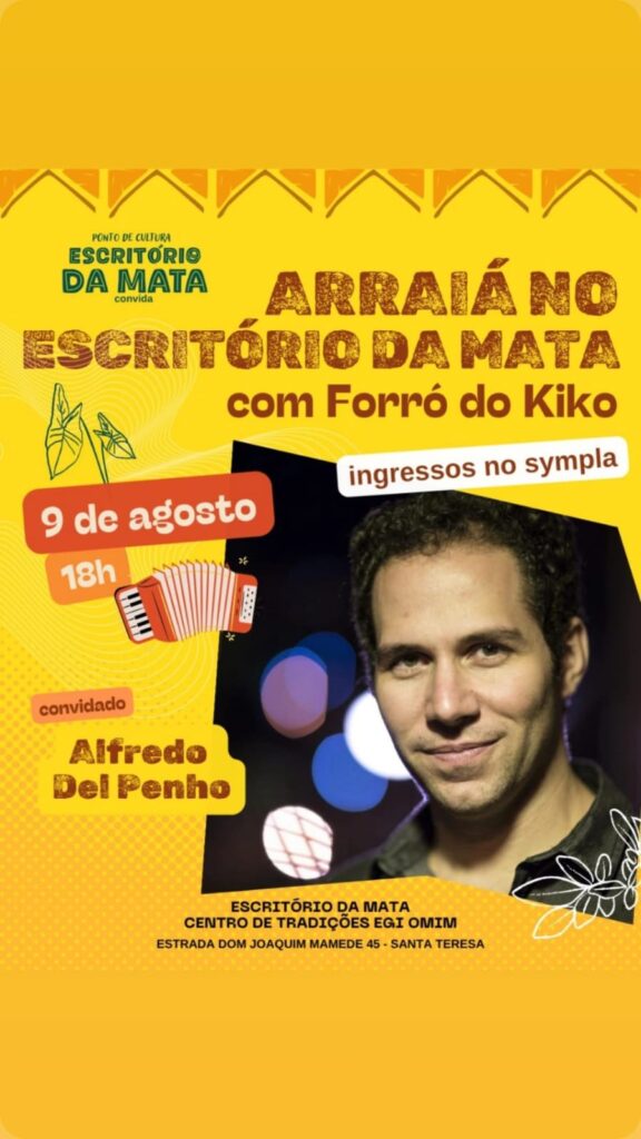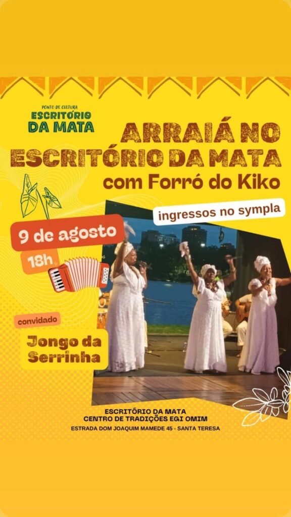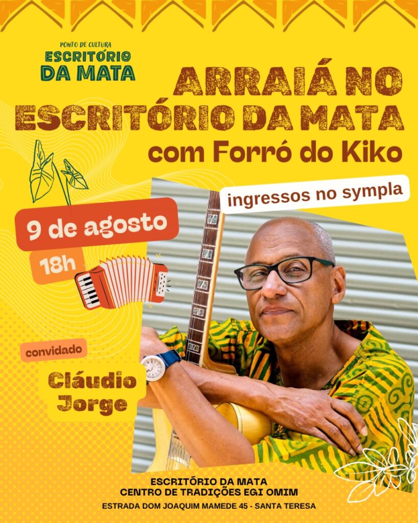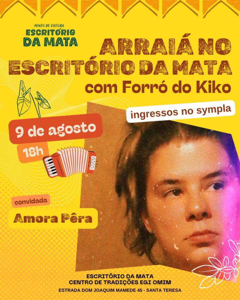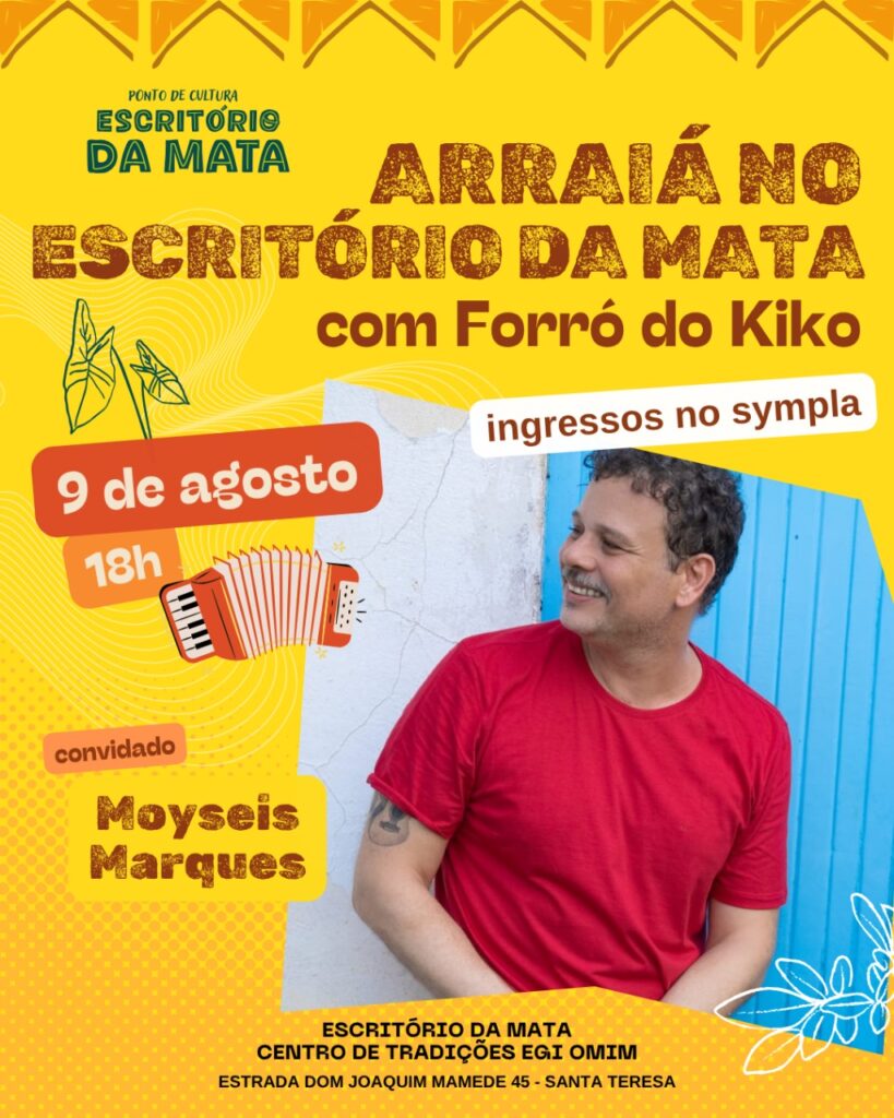 Imagine um forró que começa na raiz, mas cai para a improvisação psicodélica, onde sanfona dialoga com flauta de samba, baixo e percussão.  E não é um forró qualquer, o Forró do Kiko conta com a experiência de quase três décadas do seu líder, Kiko Horta, acompanhado de músicos que já acompanharam Sivuca, Paulo Moura, Martinho da Vila, Dona Ivone Lara, Zeca Pagodinho, Marisa Monte, entre outros. Agora coloque essa mistura em Santa Tereza, no meio da Mata Atlântica do Rio de Janeiro, num terreiro de candomblé que precisa urgentemente finalizar uma obra de readequação e estruturação do espaço e sua cozinha comunitária, que recebem um grande número de pessoas diariamente. Essa é a receita do Arraiá do Kiko — músico, Ebomi iniciado há 14 anos pela Yalorixá Wanda de Omolu e agitador cultural que transforma festa em mutirão. Com participações especiais de Jongo da Serrinha, Cláudio Jorge, Moyséis Marques, Carol Panesi, Negadeza, Mônica Besser e outros, o evento promete ser “uma Praça XV” onde tudo pode rolar, mas com um detalhe: se lotar, ninguém entra mais. “Essa combinação de artistas nunca vai se repetir”, avisa o sanfoneiro, que já levou seu forró de um sobrado recuperado de um incêndio no Centro a lotar a Fundição Progresso. Devido às chuvas, o evento foi remarcado para o dia 15 de agosto de 2025.