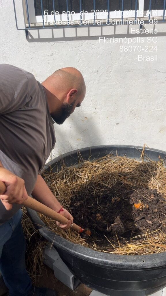 Esta percepção ampliou a missão do grupo. Se antes a pergunta central era “quanto compostamos?”, agora o foco passa a ser cada vez mais “quantos agentes de transformação formamos?”. Foi com essa lógica que a emenda parlamentar foi canalizada para três projetos estruturantes, executados em parceria com a Prefeitura de Florianópolis e outros territórios. Edson afirma que “a gente entende hoje que nossa maior métrica de impacto não é o volume compostado. Elas são os agentes prontos e capacitados para exercer essa mudança nos territórios”.