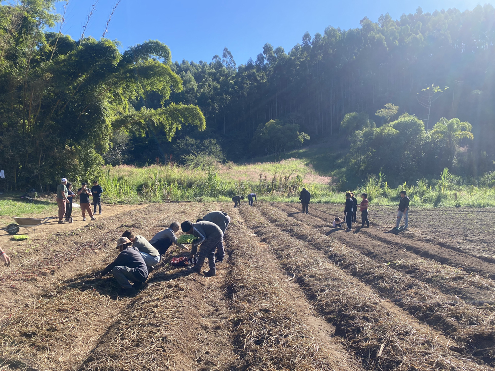 Essa integração se consolida na prática por meio de mutirões mensais cuidadosamente planejados, onde pessoas da cidade, agricultores e povos originários trabalham lado a lado. Cada território recebe atenção conforme suas necessidades específicas. Exemplo disso foi a recente ação na Aldeia Tava’í, onde uma vaquinha via PIX arrecadou R$ 1.000 para compra de calcário, insumos, combustível para roçadeira e implantação de uma horta comunitária com 2.000 mudas.