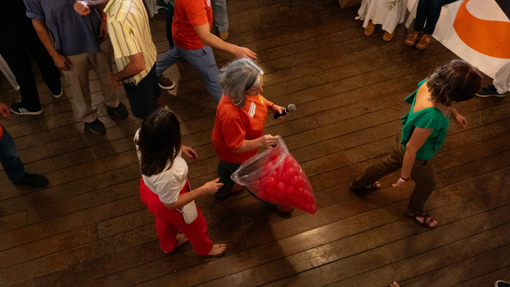 A próxima atividade, conduzida por Sandra Gonçalves, da Saúva, foi um jogo integrativo e colaborativo onde foram formadas duas rodas e cada pessoa recebeu uma bolinha. A dinâmica consistia em passar a bolinha para o(a) colega da direita e receber simultaneamente do(a) colega da esquerda num ritmo determinado e constante. A dinâmica de passar e receber, num ritmo que foi aumentando paulatinamente, exigiu um certo tempo para compreensão, absorção e uma realização harmônica. A dinâmica trabalhou a confiança e a doação.