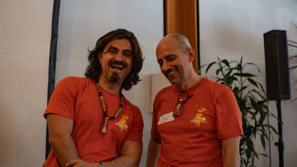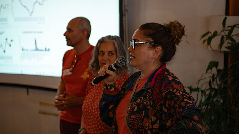 Após o almoço do 1º dia, Vera Froes, da Viridis, preparou e serviu um chá de alecrim, menta e canela; ervas aromáticas estimulantes, que trazem alegria e foco. Paulo Sérgio Pires, que compõe o núcleo de comunicação, leu um belo texto preparado com o suporte da jornalista colaboradora Luana Abreu (responsável pelos registros audiovisuais do evento). O texto enfatizou características e peculiaridades da Rede Saúva Jataí, seus objetivos, desafios e a importância das sinergias e da comunicação para o seu fortalecimento. Falou também da Economia do Ciclo Espiral, da tentativa de promover autossuficiência comunitária, distribuição justa de recursos e autonomia progressiva, superando o assistencialismo. Reforçou a importância de conectarmos iniciativas isoladas através de mediadores ativos, rituais de afeto e uma plataforma digital, transformando projetos individuais em coletivos com respostas concretas para os complexos desafios atuais.