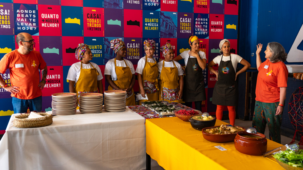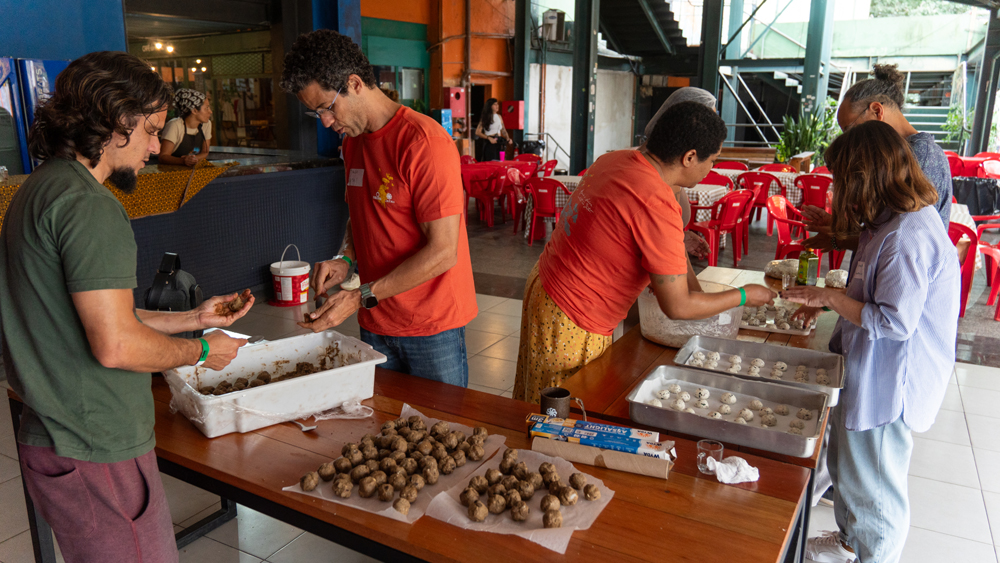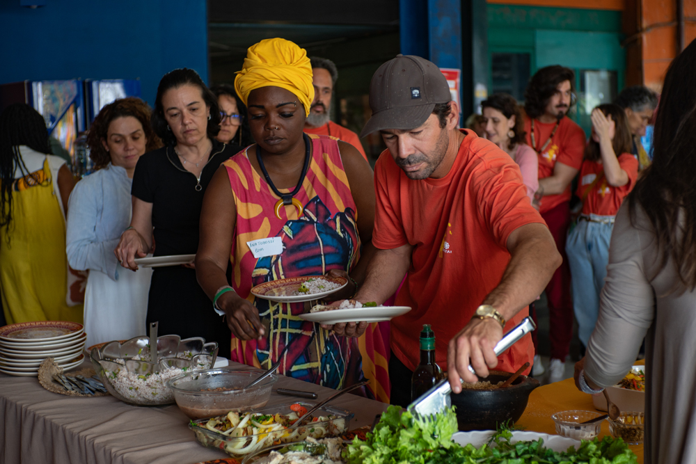 Uma novidade de grande importância neste Encontro de 2025, foi que todas as refeições foram planejadas para utilizar o máximo de ingredientes agroecológicos produzidos pelas iniciativas e preparadas pelas cozinheiras da Cozinha Solidária de Paraty/RJ, Coletivo Mulheres em Ação, do Centro de Integração da Serra da Misericórdia/RJ, e UJIMA – Cozinha Viva, de Nova Lima/MG – tudo com o incentivo e coordenação de Sandra Gonçalves, que compõe a equipe Saúva. Outro diferencial este ano foi a parceria com um Hostel onde as 42 pessoas de fora do Rio de Janeiro tiveram a oportunidade de se hospedarem juntas, o que possibilitou trocas para além da programação do encontro.