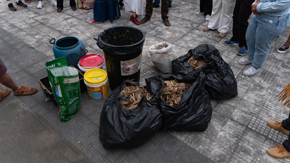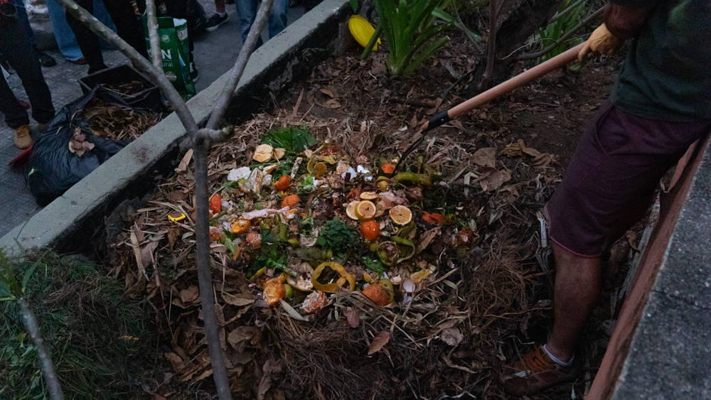 Depois do lanche, todos integrantes foram conduzidos para a varanda da Fundição, onde o Régis Furquim e Gustavo Lanza conduziram a dinâmica da Compostagem Terra Orgânica. Para essa dinâmica, explicada no dia anterior, foram recolhidos todos os resíduos orgânicos produzidos durante o encontro, no Hostel e também de quem quisesse trazer de casa. Foram reunidos aproximadamente 60 litros de resíduos nas bombonas cedidas pelo Ylê Asè Egi Omim. Régis foi traçando as semelhanças entre os processos de compostagem do composto orgânico e dos processos de elaboração e transmutação das emoções. Cada participante escreveu em um pequeno papel algumas emoções, de preferência aquelas que não são tão boas ou fáceis de lidar, e algumas potencialidades ou qualidades. Os papéis com as potencialidades foram colocados na “cama” de folhas secas e os papéis com as emoções desafiadoras foram colocadas no meio dos resíduos, que foram misturados com inoculante (terra já em processo de degradação, cheia de bactérias e fungos), mais serragem e folhas secas, e finalmente cobertas por folhas secas, formando a “leira” de compostagem.