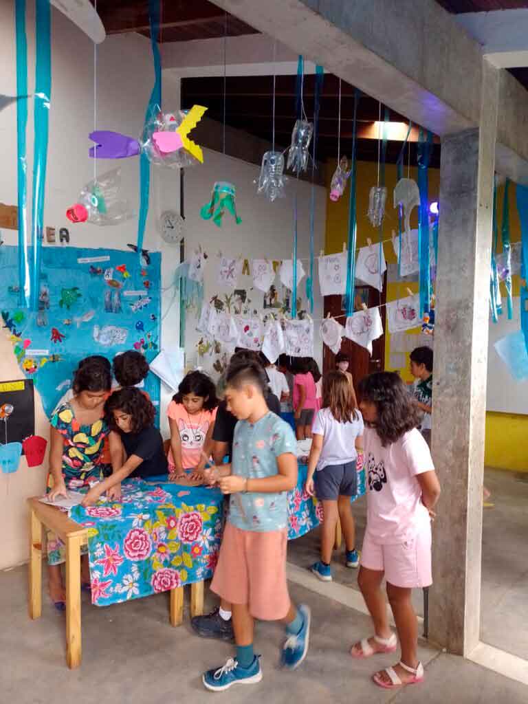 Durante todo o ano, os estudantes recolhem o lixo no entorno da escola, separam os descartáveis e orgânicos em casa e mobilizam-se em limpezas voluntárias pelas praias de Paraty. O material coletado pelos alunos e alunas em 2022 foi analisado e virou a escultura O Peixe, que fez parte da Mostra da escola no dia 3 de dezembro.