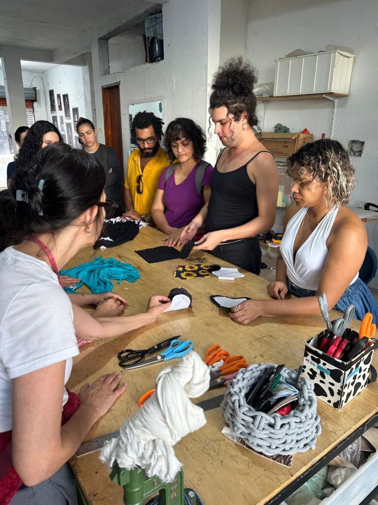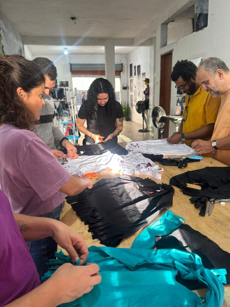 Em um encontro marcado pela troca de conhecimentos, professores do INOV visitaram o Centro Cultural e as instalações do Remexe para conhecer o projeto de perto e vivenciar a metodologia de trabalho do ateliê. A atividade prática tomou conta da cena: em uma hora, os visitantes transformaram camisetas de malha em ecobags funcionais, utilizando apenas tesouras e técnicas de upcycling. “Como o tempo foi muito curto, porque foram conhecer o Centro Cultural, a gente passou para eles uma oficina que não utilizava linha, costura, nem nada. Era só tesoura e uma blusa. Eles pegaram uma camisa de malha e transformaram em ecobag, somente com tesoura e a mão mesmo. Ficou muito bacana. Eles adoraram”, conta Quellemara Lomasso, supervisora do Remexe.