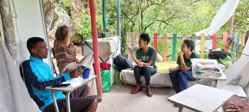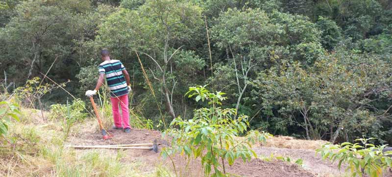 Os dois hectares liberados para o projeto já tem hortaliças, batata-doce, aipim, inhame e algumas frutíferas, como bananas e abacaxis. A plantação é orgânica, aproveitando a compostagem e o esterco produzido lá mesmo e sem necessidade de complementação externa. O processo de plantio começou há seis meses e não foi tão rápido; a área é montanhosa e foi preciso fazer canaletas e cercar o terreno. A ideia agora é expandir o cultivo para uma outra área próxima, de seis hectares, incluindo a expansão de um galinheiro que já existia anteriormente e fornecia ovos para os alunos que frequentavam uma escolinha da comunidade.