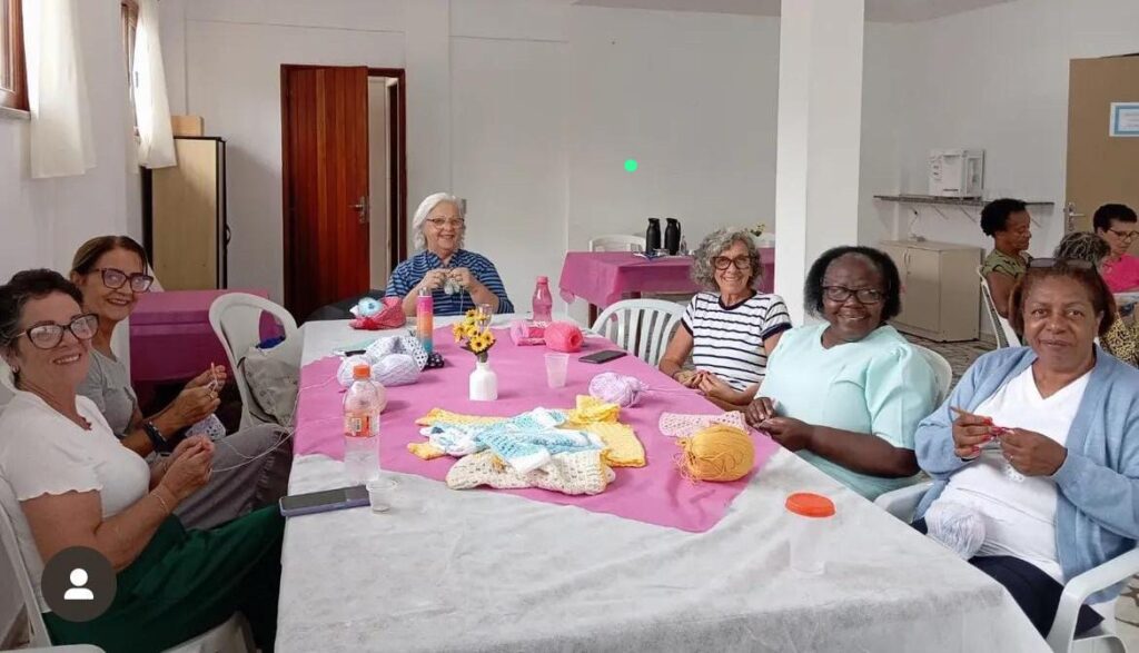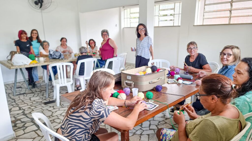O projeto nasceu das mãos habilidosas de Sayuri, que transformou sua paixão por manualidades em ferramenta de transformação social. Nas reuniões semanais no CRAS, mulheres encontram muito mais que aulas de crochê – descobrem um espaço de pertencimento. A magia acontece na horizontalidade: não há professoras, mas sim troca de saberes onde cada uma ensina o que sabe. Em 2024, o grupo confeccionou mantas para um asilo; em 2025, voltou suas agulhas para roupinhas de bebê que acompanham enxovais doados a gestantes em vulnerabilidade. O diferencial é que parte da produção é remunerada com a Muda, moeda social que pode ser trocada por alimentos na feira orgânica vizinha – criando um ciclo econômico solidário que valoriza o trabalho dessas idosas.