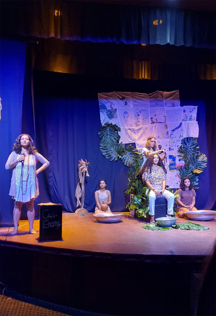 Com residência no Teatro Adolfo Bloch através de parceria com a Secretaria de Cultura, o projeto mobilizou artistas locais sob a coordenação de Bruna Brasil, que é muito engajada e influente na área cultural de Teresópolis. “Ela conseguiu mobilizar um monte de gente, como tutores, e a gente propôs a remuneração em Muda para profissionais que apoiam”, conta Sayuri. Ela explica que não são aulas de teatro propriamente ditas, mas uma comunidade de aprendizagem que tem o teatro como linguagem. É a filosofia do Colo da Montanha se replicando em outros territórios.