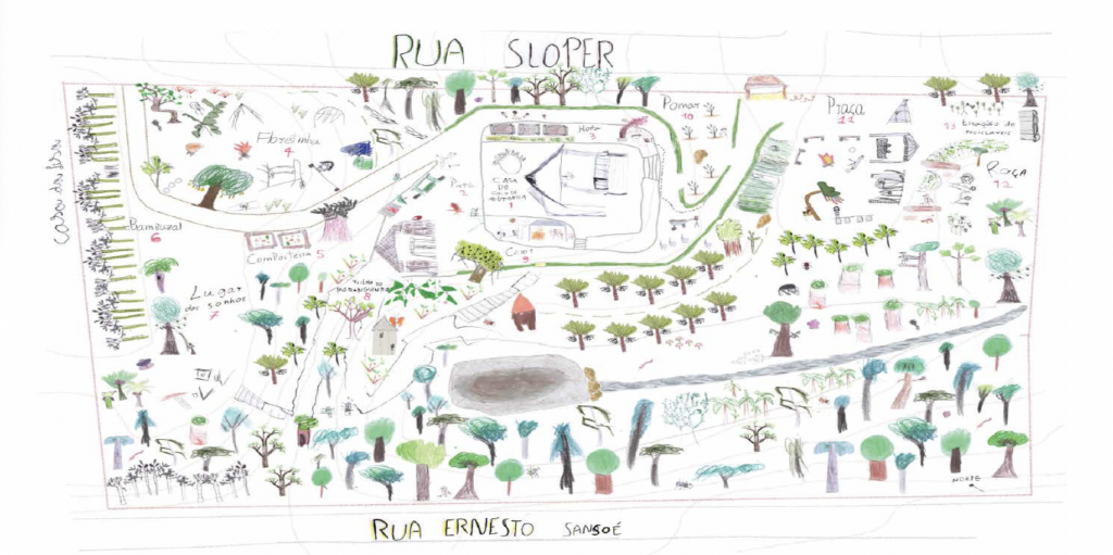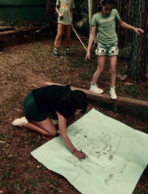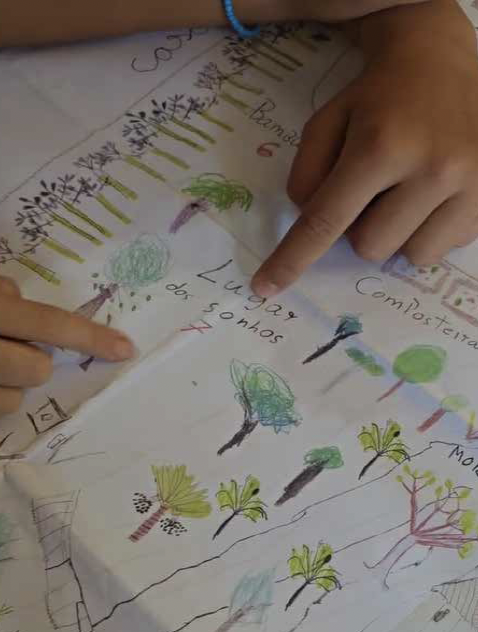 Só depois vieram as caminhadas. Com foto aérea e mapa técnico nas mãos, o grupo saiu em duplas para reconhecer o território. A surpresa foi imediata: os mapas existentes “estavam faltando muita coisa”. As crianças sabiam exatamente onde era cada árvore boa de subir, onde ficava o gambá, qual trilha levava à casa da bruxa. O saber delas era outro – mais encarnado, mais íntimo.