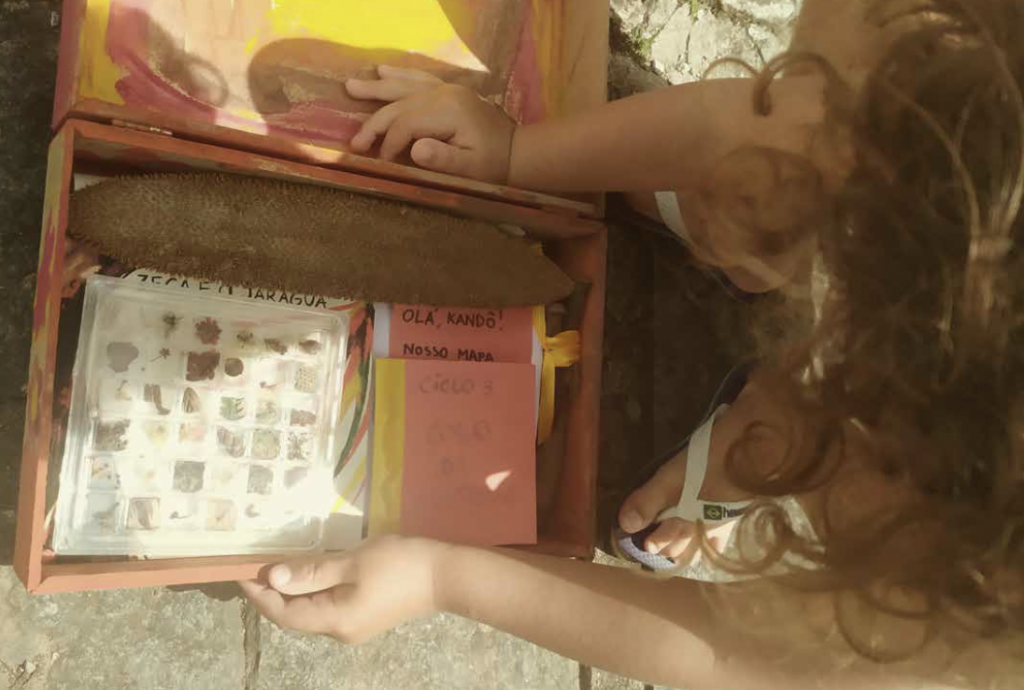 A última resposta abriu uma derivação. O grupo decidiu enviar seu mapa e uma caixa de tesouros com pedaços de colmeia, cogumelos, sementes, musgos, pregos do Jequitibá, cartas com perguntas até o espaço Kandô, uma escola de Santana de Parnaíba, em SP, cujo Ciclo 2 estava justamente estudando pontes, travessias e conexões.
