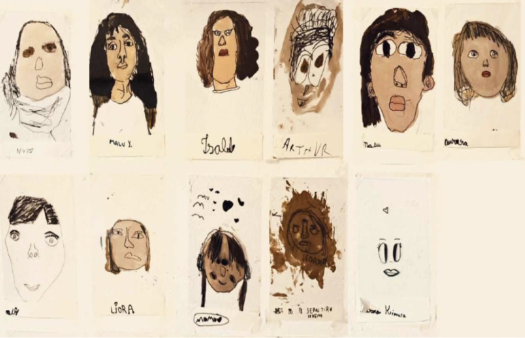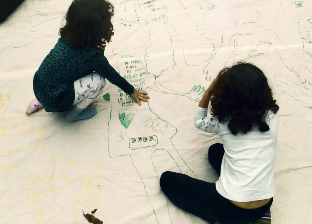 As crianças misturaram tintas em busca das próprias cores de pele, se desenharam em espelhos, fizeram autorretratos. Refletiram sobre colorismo com a educadora Alessandra Guimarães. Depois, num grande tecido de algodão cru estendido no chão, fizeram o contorno dos próprios corpos em escala real e dentro desses contornos, escreveram e desenharam tudo o que amavam no Colo. Fogueira. Festas. Florestinha. As pessoas. O lanche lá embaixo. A passagem secreta.