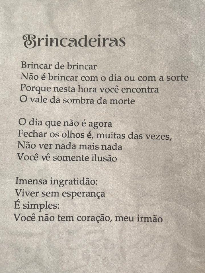 A vida é difícil, mas pode mudar. A vontade de viver é que me faz escrever, ter esperança. Quando uma coisa ruim acontece, penso: vou transformar em uma coisa boa. Vou escrever. É minha rota de fuga, relata Terezinha.